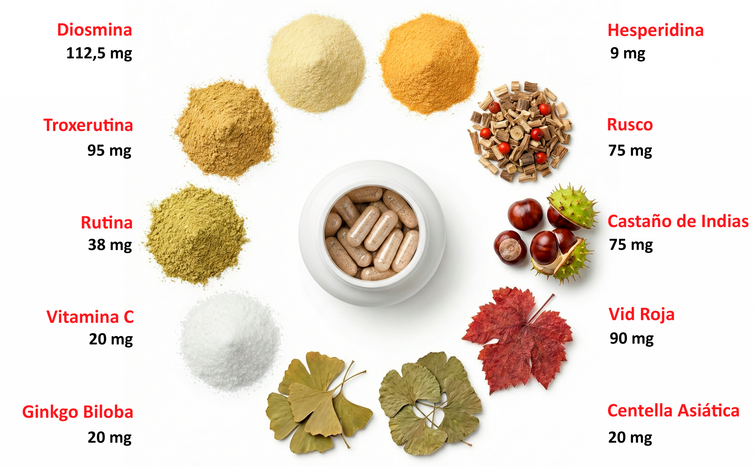 Diosmina - Troxerutina - Polifenoles - Ruscus - Escina - Rutina - Centella Asiática - Ginkgo Biloba - Vitamina C - Hesperidina