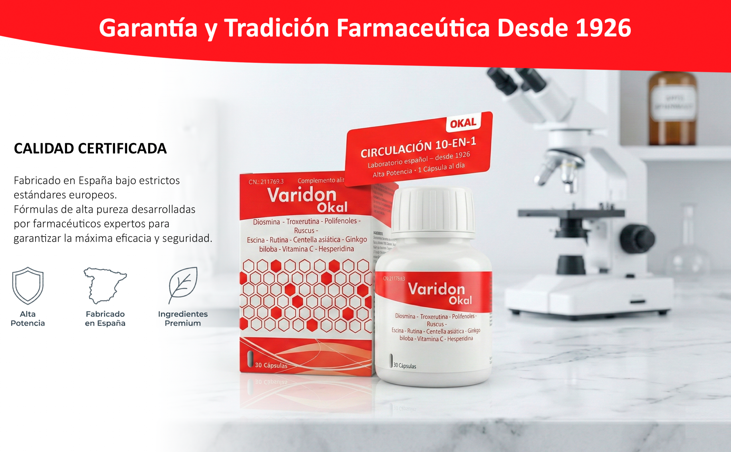 ¿Cansado de la pesadez, hinchazón y varices en las piernas? Recupera la ligereza y comodidad que mereces con Varidon Okal, el complemento alimenticio con fórmula avanzada 9 en 1 basado en ingredientes naturales clínicamente estudiados.